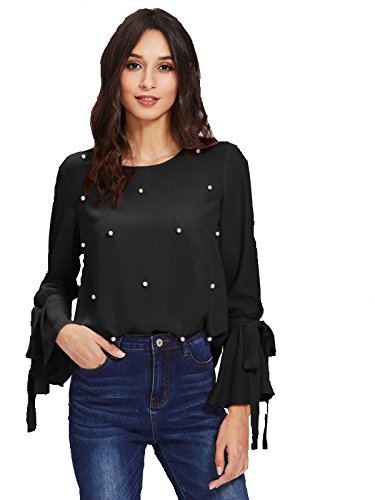 POISON IVY Women's Casual Long Bell Sleeve Pearl Embroidered Top